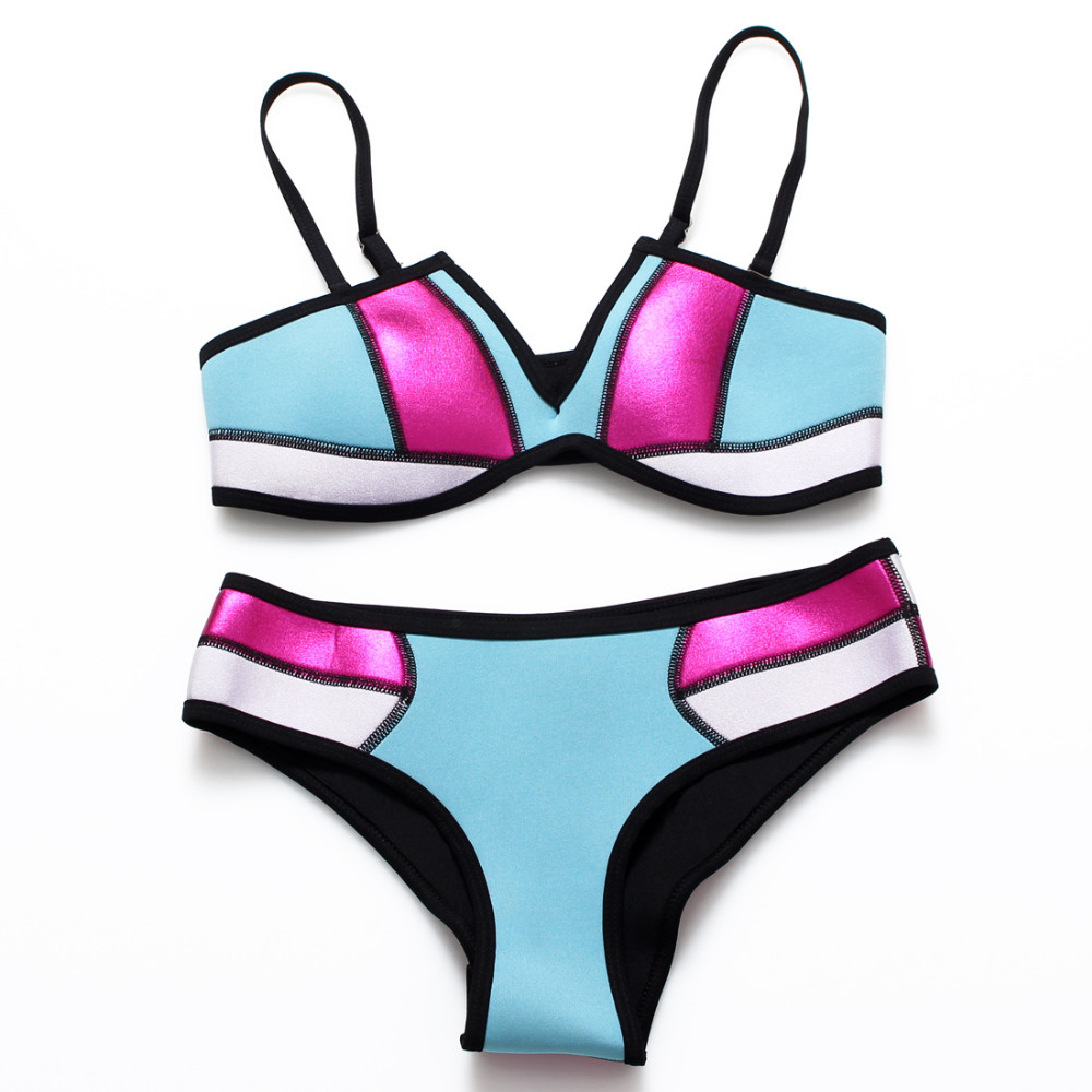 Sexy 2016 Women Low Waist Beach Bikini Neon Swimwear Blue Bathing Swimsuit Neon Patchwork Bikini Set